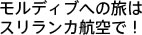 日本からモルディブへのアクセスは、成田から唯一のモルディブ直行便があるスリランカ航空が便利。個別のシートテレビ、リラックスできる快適な座席など機内設備も充実。ダイバーやサーファーの利用が多いため、無料手荷物の重量を拡大するなど独自のサービスにも余念がない。また評判なのが、紅茶のサービス。空の上で本場のセイロンティが楽しめるのは嬉しい限りだ。世界的な賞を多数受賞したサービスを堪能し、モルディブまでのフライトをゆったりと楽しみたい。