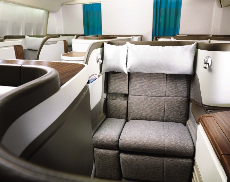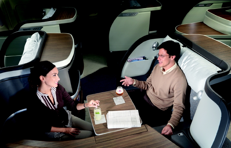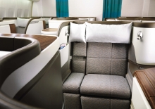 新しいファーストクラスはこれまで以上にプライバシーが確保され、乗客自身が周辺環境を自由にコントロールできるようになった。就寝時には、現行旅客機では最大級サイズのベッドに。座席に友人を招いて、会話や食事を楽しむこともできる。「スイートルームのような極上でプライベートな空間での最上のもてなし」というコンセプトを、見事なまでに実現している。