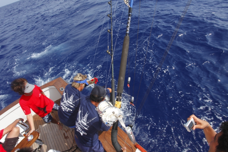 二日間続けてまったく手応えがなかった林たちは祈りにも似た思いを抱えていた。いつものごとくロッドを船縁にたてラインを流してからも、休むことなく海上に目を馳せる。昨日までの結果では、カイルア・コナより南の海域での当たりが多かったと聞き、南へ進路を取るように船長に伝える。