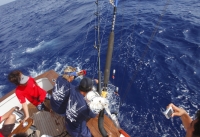 ボートクルーの叫び声に、全員飛び上がって船尾へ急ぐ。アングラーは若手・山口だ。山口は席に飛び乗ると、慎重に、だが敏速にリールを巻いていった。引きの具合からいってさほど大きくない獲物のようだ…。やがてあがってきたのは、大きなシイラだった。惜しいかな、シイラはHIBTのポイント対象にはならない。獲物があがった安堵と共に軽い失望が船内をよぎる。だが、とにかく久しぶりのヒットにメンバーの気持ちは明るくなった。