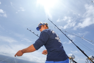 アドレナリンが一気に上昇し、手のひらが熱を帯びる。視線はまだ見えぬ、海中の獲物に集中する。ロッドをつかむ腕にはカジキの必死の抵抗が伝わってくる…。手応えは十分だ。逃さんぞ…! どのくらい経っただろうか。船縁にマリーンの姿が浮かび上がった。170ポンド(70kg)ぐらいだろうか…。ボートクルーがすばやくタグを打つとルアーをはずす。ふいに腕への負荷がなくなり、林は椅子の背に寄りかかった。
