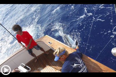 ビルフィッシュを吊り上げる林。250ポンド(約113kg)に満たず、逃がした方がポイントが高くなるため、タグ&リリースする(画像クリックで動画を再生)。