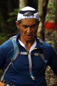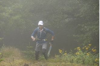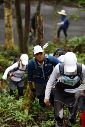 7時10分にコースへ飛び出した競技者は、スタートからしばらくは緩やかな舗装路を登っていく。トレイルの入り口は、およそ1・5キロ先の急勾配の小さな滝だ。水の流れに逆らいながら、石から石へと足場を確保していく。石や岩を効果的に活用するのは、ぬかるみに足を止られないようにするためだ。ゆっくり、確実に登る。走ることはできない。