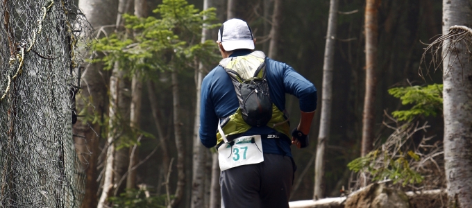 ゲレンデを登り切り、エイドステーション(※)を越えると、今度は森林をひたすらに登っていく。白根山登山のコースにも重なるが、ハイキング気分などはほど遠い。目印となる白いビニールと、先行するアスリートが残すわずかな足跡を頼りに、森林を分け入っていくのだ。登り、走り、滑り、歩き、登る。平坦に感じられる道も、実は緩やかな登り坂になっているところが多い。じわじわと疲労が忍び寄ってくる。