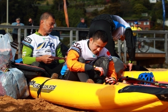 エクスペディションレースはチームでの行動が原則なので、2艇のシーカヤックがあまり離れてはならない。チェックポイント(以下、CP)1を通過し漕ぎ進んでゆく選手たち。そんな中、強風により流されるチームが続出し始めていた。それでもトップチームはほぼ予定通りトランジションエリア(以下、TA)に姿を現した。最初に入ってきたのはニュージーランドのSeagateだった。