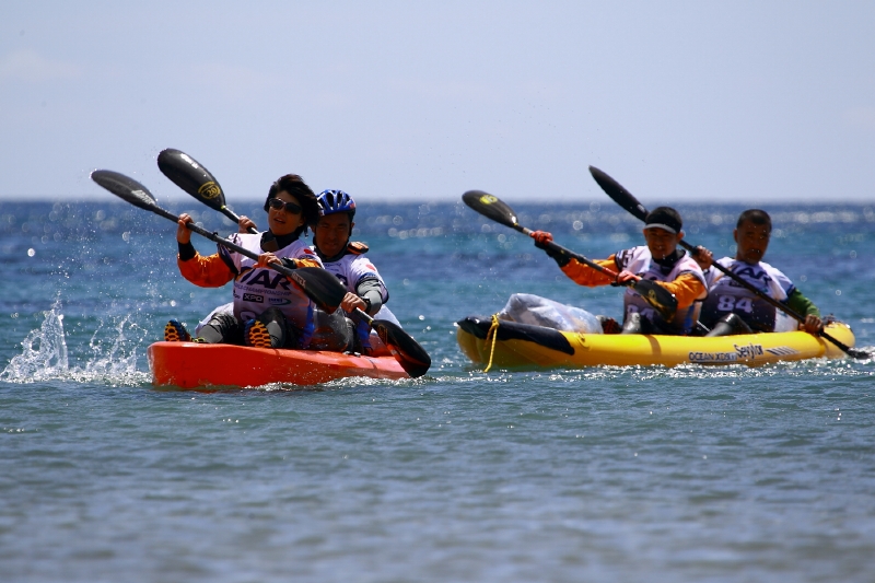 約180艇ものシーカヤックが一斉に海へ漕ぎ出す様はかなりの迫力。その中を割り込んでいくのはなかなか難しい。RDは南と重鎮、小澤とナディが組んで海へと漕ぎだしていった。