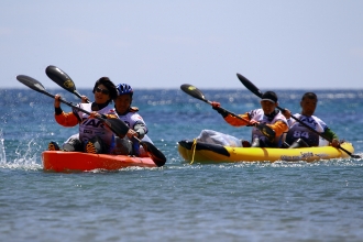 赤みを帯びていた空は徐々に青空へとかわり、軽くウォーミングアップする選手たちの姿が見られるようになった。海岸にはたくさんのシーカヤックが並べられ、準備に追われるチームの声が飛び交っていた。