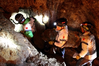 たどり着いたCP9で一旦MTBを降り、ケービングセクションに突入。真夜中に洞窟内のCP10を探すのだ。観光用の洞窟だが、この日のために特別ルートが用意され、ほふく前進でなければ通れないような狭さ。なんとかクリアし、びしょ濡れになりながら洞窟を出たときは、一日で最も寒い時間帯になっていた。