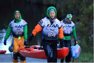 そんな一つ一つの言葉に「それはないから」と南が笑い返す。 一旦接岸し、TAにて2人乗りのカヤックに乗り換える。暗闇の中、極寒の湖をさらに約20kmのパドリングが続く。そんな最中、小澤が大量の鼻血から貧血を起こすというアクシデントが発生した。途中のカヤック運搬区間にて止血の処置をする。一方、寒さと疲労から重鎮の幻覚症状も増して行く。