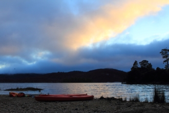 1艇の2人乗インフレータブル・カヤックになんと装備を抱えた4人が乗り込み、約8kmのマッキントッシュ湖を進む。湖には葉のない皮肌の白い枯れ木があちこちに現れ、幻想的な雰囲気を醸し出していた。これまで経験のない長丁場のレースと足の痛み、そして平均2時間程度の睡眠から重鎮が睡魔に襲われる。必至で漕ぐ3人に向かって時々幻覚を見たような言葉を発し始めていた。