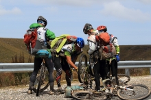 廃線沿いの少々難儀なCPを探し出し、ようやく走りやすいロードセクションにでた。と思ったのもつかの間、小澤のMTBのチェーンが泥でつまり、思うように走れない。坂道でギアを変えようにも変速はするが、咬んでしまうのだ。途中からMTBを引きながら走り始める始末。すぐに異変に気がついた南が立ち止まり様子をチェックし、経験豊富な重鎮が適切なアドバイスを出して泥づまりを回復させる。
