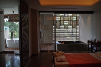 最上級のサンカラスイートは森を望むアウトバスとプライベートスパルームまで用意された究極の部屋。籠もるためだけにリザーブしてもいいほど。すべての部屋のバスアメニティにもこだわりが。シャンプーはタイの高級オーガニックコスメ「THANN」、シェービングセットは替刃型の本格的なキットを用意。歯ブラシはとうもろこしのでんぷんを利用したハンドルに、天然素材の豚毛を使用。環境への配慮が徹底されています。