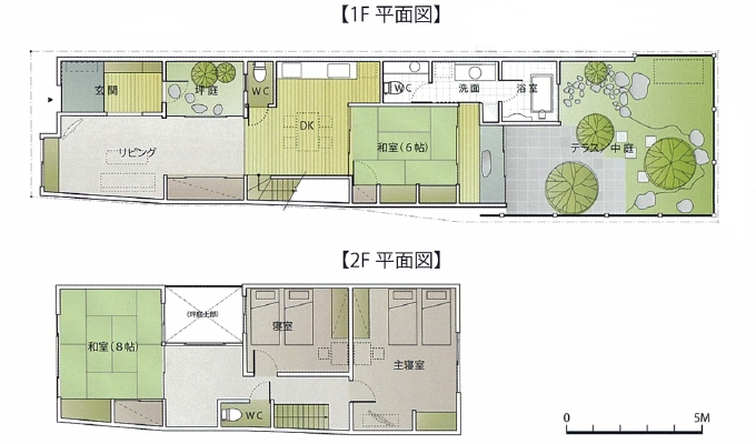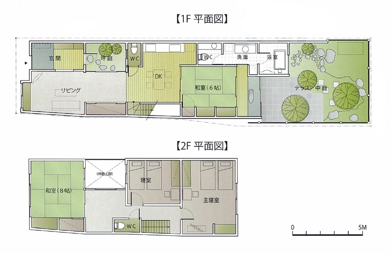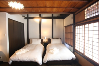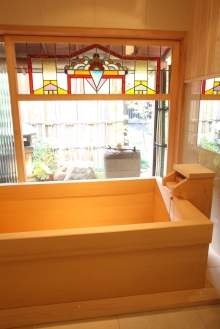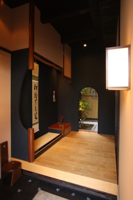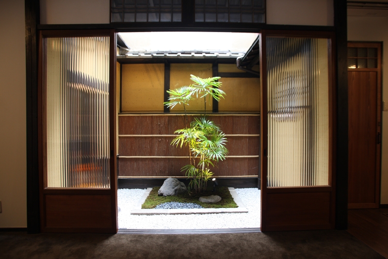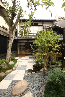 一歩中に入れば、町家ならでは木のぬくもりと、敷石の美しい坪庭に、楓や桜、苔など植栽も豊かな裏庭で、移ろう京都の四季を感じることができます。床の間に生けられる季節の草木や、お軸からも古都に息づく文化に触れることが出来るでしょう。リフォームが施されたバスルームは美しい高野槇造りで、香りの癒しも楽しめます。