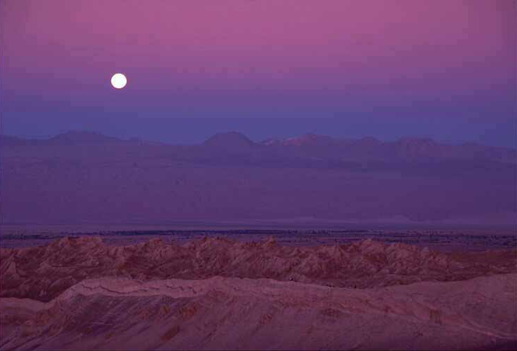 砂漠に登る月。幻想的なチリのアタカマ砂漠の風景。
