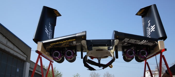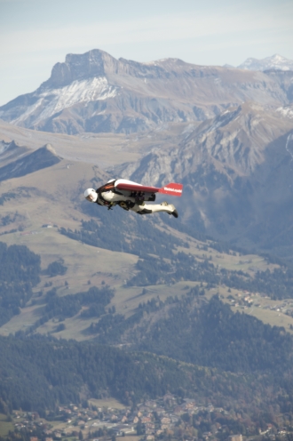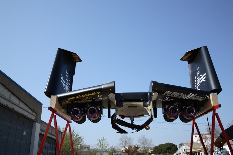 折り畳み式のウィングをリュックサックのように背負い、4機のジェットエンジンを稼働させ、文字通り“飛ぶ”。自ら研究と開発に打ち込んだ、曰く「空を飛べるクルマ」で、イヴ・ロッシーはアルプス越えに成功し、ドーバー海峡横断も実現させた。母国スイスはもちろんイギリスやフランスの主要メディアでも報じられ、「ジェットマン」、「フュージョンマン」、「バードマン」といったニックネームで呼ばれるようになった。彼自身は「ジェットマン」を好み、ネームカードにもこの肩書が刷り込まれている。