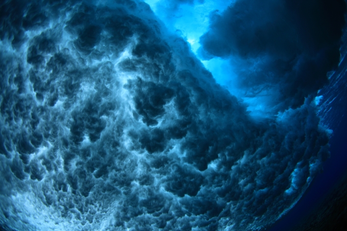 「水面である程度まで見ていて、波を引き寄せ、『来たっ』と思って潜ると、波は速いので頭の上にある、という感じです。長いときは5時間くらい海に入っていますが、写真を撮っている時間なんて一瞬ですから、波を待っている時間とかわしている時間がほとんどですよね。潜るタイミングはすべての感覚を総動員して決めます。最悪なのは、落ちてきた波を背中でまともに受けること。背骨が折れてしまうこともありますから、かなり危険です。なので、とにかく深く勢いよく潜る。怖がると筋肉も酸素を消費してしまうので、強い気持ちを持って、平常心でいることが大切ですね」