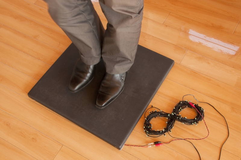 これが発電床。右下の8字を描いたコードのLEDが点灯している。