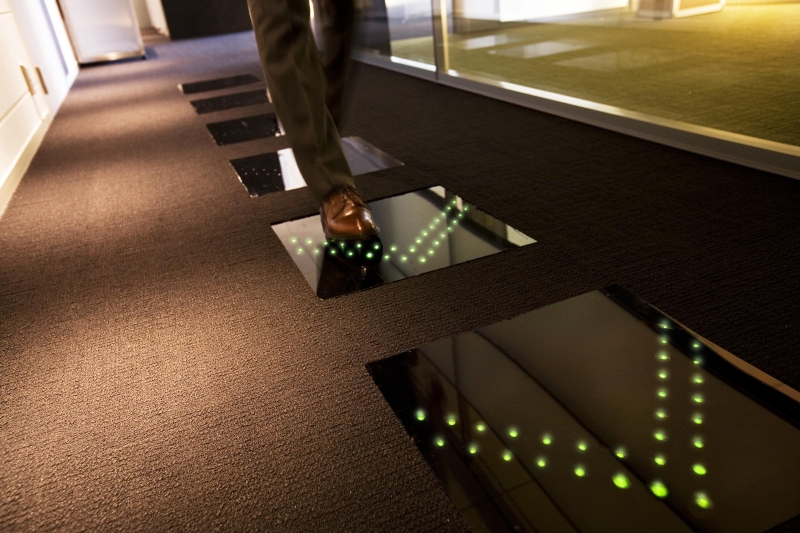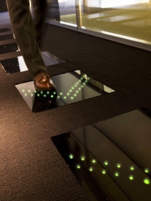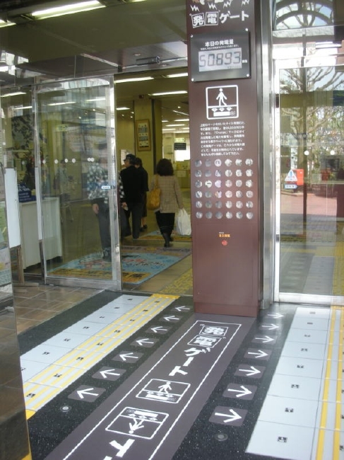 その一つに、「発電床」がある。その名の通り、発電する床だ。目安としては、60kgの人が発電床を軽く踏みながら通ることにより瞬間的に0.1~0.3Wの電力を生じる。この発電床は、既に実用化に向けて試験導入が行われている。たとえば、オフィスフロアの廊下。停電時でも、踏むだけで明かりが点灯し、非常階段への誘導灯になっている。また、水族館や大型商業移設などでは、人が通るたびに美しいイルミネーションが点灯。電力消費を抑えながら、楽しませてくれる。さらに、来年以降には大手タイルメーカーと共同開発で、タイルとして市販される予定だ。