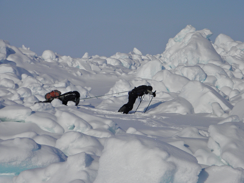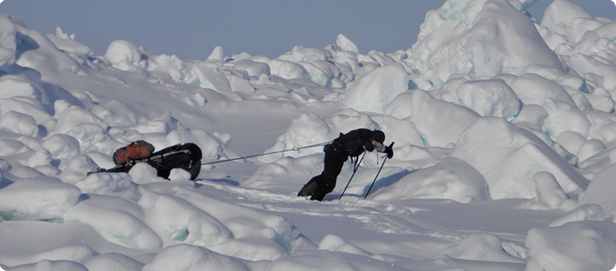 北極圏では100kgほどの装備、食糧など荷物をソリで引いて踏破した。