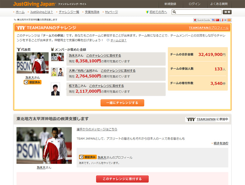 ジャスト・ギビングにて為末氏が呼びかけ結成したTEAM JPAPANのページはコチラ