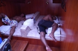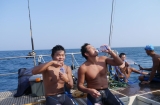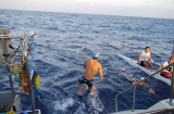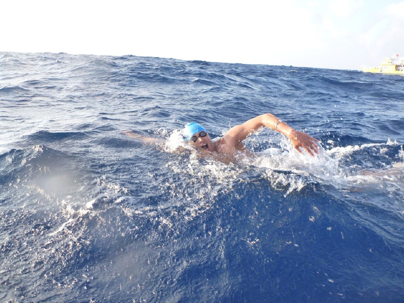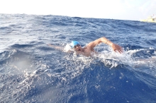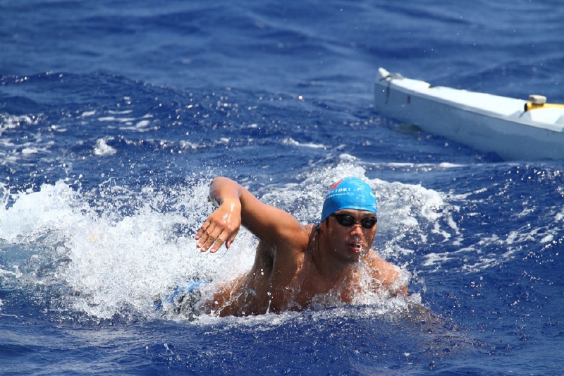 純粋な人間の力にこだわり、浮力を得られるオーシャンスイムのウエットス-ツは着用せず、あえて水着だけで泳いだ。クラゲに刺されたり、シャ-クフィ-ルドに触れてビリビリ来たが我慢した。海水温度が高いので、30分泳いで船に上がると脱水症状のようになり、水を毎回1リットルも飲んだ。6名は1mでも台湾に近付くべく、海面を必死で漕いだのだ。