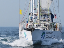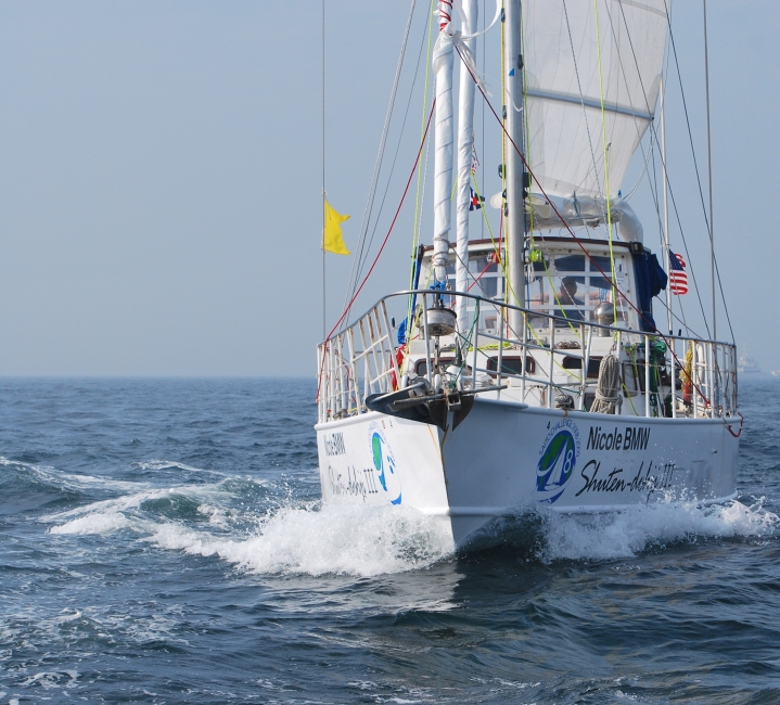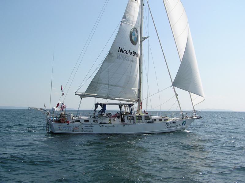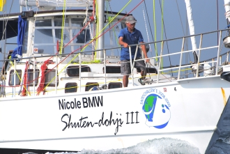 シングルハンド艇としては大型な「Nicole BMW Shuten-DohjiⅢ」海上での斉藤氏は忙しい。
