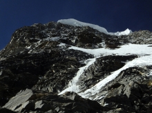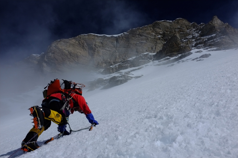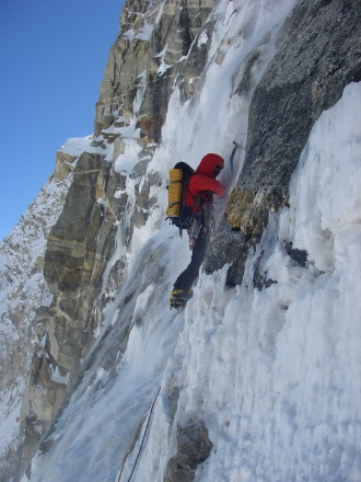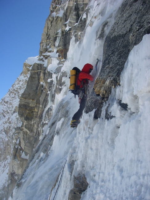 落石や雪崩の危険のある非常に難しい氷壁だったが、これしかない!と見出したラインに取り付いた。しかし険しい壁を登るにつれ、上の方に雪崩の危険が見てとれた。「すぐ降りるべきだ」という平出の提案を受けいれることができず、氷壁で一晩ビバークするが、翌日にはそのルートをあきらめた。とぼとぼとベースキャンプに戻った後、ルートを変え、やはり未踏の南面の氷と雪の壁へ再トライする。そして壁を登り切り、南峰を初登頂――その途中で誰もみたことのない、感動的なシーンに出会った。
