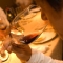 ラフィットは、松原さんにより、細心の注意を払って慎重に―あまりにゆっくりなので「腕が保たない!」と悲鳴を上げたほど―10杯のワイングラスに注がれ ました(デキャンタージュはしないと事前に相談して決めていたので)。香りをかぎ、色を見るFaustたち。褐色がかった深いルビー色とでも言いましょう か。