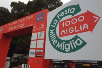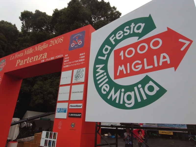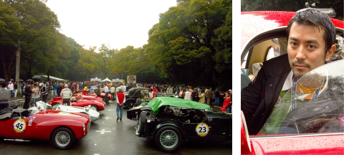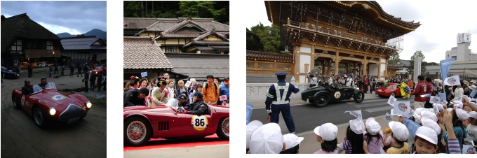 右:ラ フェスタ ミッレ ミリアのゲート。レースは、戦前から1967年までに製造されたヒストリックカーで東京・原宿の明治神宮前から日光、猪苗代、裏磐梯、白石、郡山などの名所旧跡を巡りおよそ1600km(1000マイル)のルートを踏破するもの。
