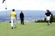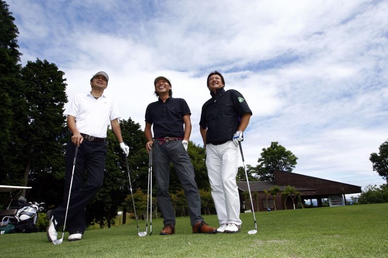 今回は対抗戦とはいえ、一緒に回る組は全員ファウスト・ゴルフチーム同士。やはりいずれ劣らずの負けず嫌いぞろい、自然“ファウストのなかで負けたくない”という気持ちがホールを進むごとに強くなってくる。スコアについても、まず「他のファウストの組はどんな感じか」とキャディーさんに確認を求めた。 ファウストでは最後の組で9時16分にINスタートとなった、マーク川島、瀬口直嗣、井上盛夫の3人は、スタートがINとOUTに別れてしまったため、状況がリアルタイムにつかめず、他のファウストメンバーの調子が多少なりとも気になったようだ。