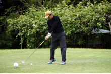 そんななかマーク川島は、頭をしっかり残しながら肩を回転させたスイングアークも大きなショットを放つ。しかし、今回はレギュラーティーからのショットとあって、他の飛ばし屋メンバーと同じく、2打目のポイント探しに最初戸惑い、それが結果的にスコアにも響いてしまう。終日、忍耐力が求められるゴルフだったが、後半に入ると本来の腕前を発揮。柔らかいスイングで次々とナイスショットを決め、最後となったアウト9ホール目は見事なバーディーで締めた。