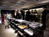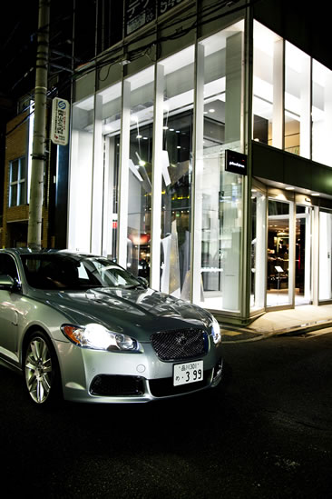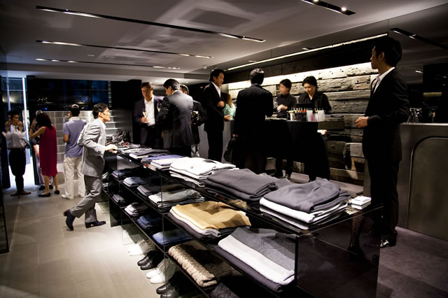 上段左:夜の青山に光るジュリアーノ・フジワラ青山店外観。当日は、先行試乗車として最新のジャガーXFRで登場するファウストの姿も。上段右:1階レセプションの会場には、スーツやジャケットをはじめ、こだわりのファッションアイテムがずらりと並ぶ。下段左:地鶏のあぶりや、鴨ネギ、和牛のローストビーフ、ズワイガニとパプリカのテリーヌ、車海老と平目のお寿司、トマトとクリームチーズなど、色鮮やかなピンチョス。下段右:数多くの冒険家たちをバックアップしてきた物語を持つ、MUM社のシャンパン。 「WABISABI」を表現するファッションアイテムが並ぶ店舗の一階で、まずはレセプションが始まった。