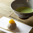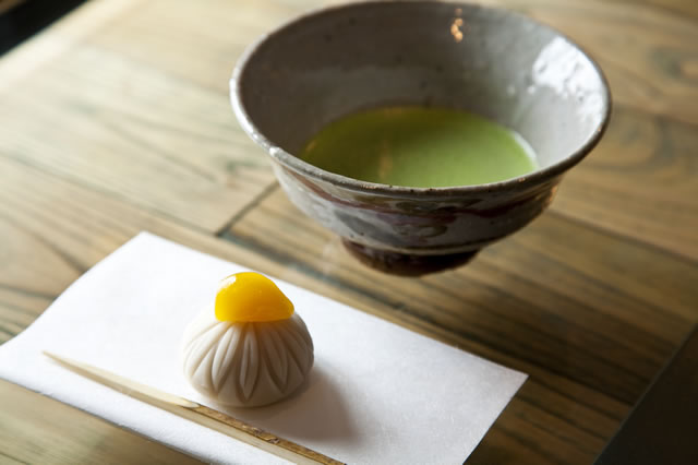 最初に運ばれてきたのは、お菓子。青山菊家のお菓子は、重陽の節句にちなんで、栗と菊を模した「菊のしずく」。それを静かにいただきながら、茶筅がお茶をたてる音を聞いている。