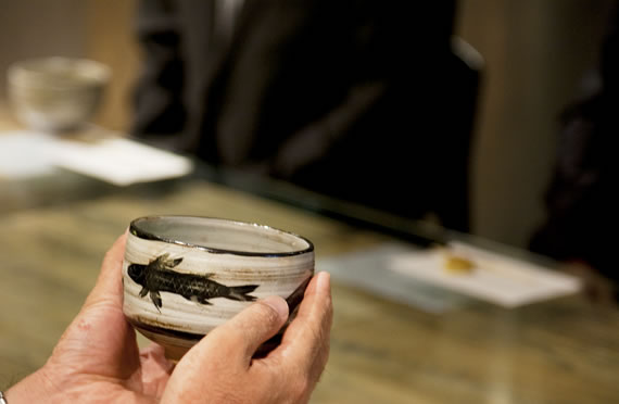 それは、今藤先生の亡きご主人であり、昭和を代表する長唄三味線の演奏家、そして人間国宝として知られる三世今藤長十郎氏の手による茶碗で、魚の絵が描かれていた。この日の3日後に、六本木ヒルズで開催された海にまつわるイベント『東京アクアリオ2009』を控えていた木村氏は、この器との出会いに、アクアリオの成功を確信したようだ。