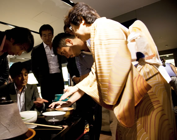まずはマツハシ・エンタープライズの松橋正人氏から、ゆっくりとお茶をいただく。その器は、人間国宝・石黒宗麿によるもの。それから、5つの器が順番にファウストたちのもとへ運ばれ、一服目をいただいていく。