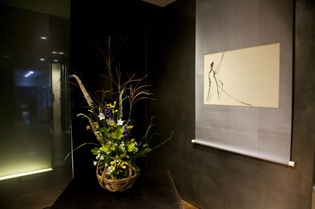 しかし、この茶会の日は、その様相を一転していた。突き当りのガラスに黒い紙を貼り、その手前には秋の草花の清楚なたたずまいが映えている。裏千家ならではの御薗棚(※みそのだな)の上には、虫蒔絵の薄器が置かれ、秋の風情を感じさせる。また、軸は書家・閑万希子氏による「波」。さながら、秋の海といったところか。