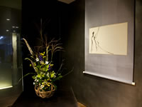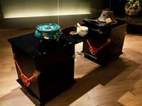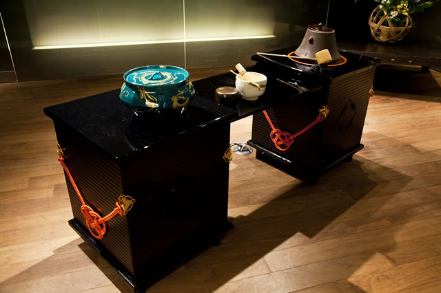 秋風漂う9月の宵。千利休の心を今に伝える裏千家の教授が亭主、モダンなアプローチで知られるジュリアーノ・フジワラが主催の、立礼式のカジュアルな茶会である。そのしつらいはどのようなものか、と、期待が高まる。