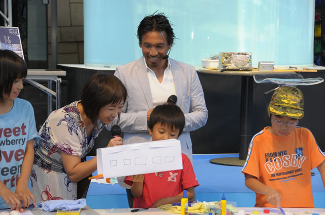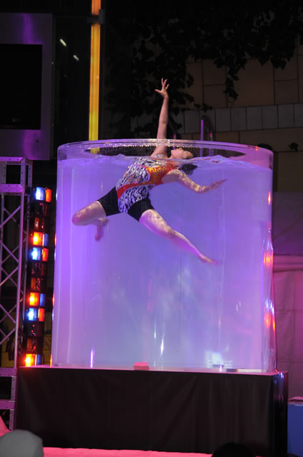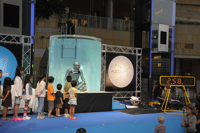 ステージ上には、木村が作った円柱の大水槽が設けられており、今回のテーマを提案した篠宮が、フリーダイビングの公式演技である「スタティック」に挑戦。来場していた子どもたちと、競争し、四分間あまり、余裕で息を止め続け、歓声が沸いた。また、同じ水槽の中でアテネオリンピックの銀メダリスト、川嶋奈緒子がシンクロ実演を行い、拍手喝さいが沸き起こった。