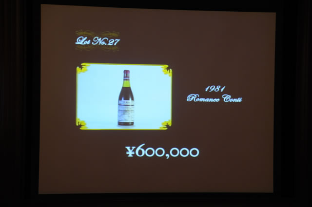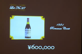 こちらは、壇上のオークショネアによって進行される通常のオークションです。提示されるスタート価格に対し、落札希望者はオークション参加番号が書かれたボードを頭上に掲げ、希望者がひとりになるまで価格は上がっていきます。オークショネアの軽妙なしゃべりも手伝って、ロット数にして40を超える貴重なワインが、次々に落札されていきました。