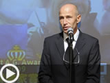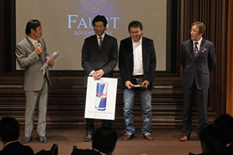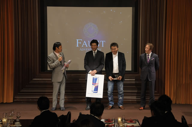 続いて、同日昼間に六本木ヒルズ「マドラウンジ スパイス」で行われたファウストA.G.アワード2009授賞式の模様が映像で紹介され、続いてステージ上には受賞者のイヴ・ロッシー氏(ファウスト大賞および冒険家賞)、室屋義秀氏(挑戦者賞)、坂本達氏(社会貢献活動賞)、三浦雄一郎氏(特別賞)の登場となりました。「地球上でもっともファウストな人物」に選ばれた4氏は、授賞式を終えた後とあってリラックスムード。それぞれのスピーチでは、会場が大きな拍手と笑いと感嘆に包まれました。
