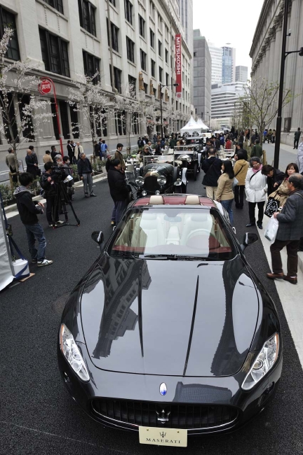 ゴシックの建築様式とエンタシスの列柱が美しい三井本館前(1998年重要文化財指定)。日本橋へと向かう隊列の待機場所として。また、当時の自動車愛好家たちが集うシーンを再現するための場所として三井不動産の協力・後援を仰いだ。路上では一般来場者に対し、UCC上島珈琲の協賛によりコーヒーが振る舞われた。整列したクラシックカーの周囲はカメラを持った多くのギャラリーで埋め尽くされた。左は移動の際に隊列の先頭車両を務めたマセラティ・グランツーリズモ・スパイダー。