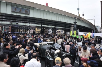午前9時。日本銀行本店前に集結する歴史的クラシックカーの数々。1896年に施工された日本銀行本店本館は、明治・大正期の建築家、辰野金吾氏の設計による建物だが、同氏が英国に留学経験があるためだろうか、クラシックカーとその背景がごく自然な風景として目に映る。歴史ある自動車メーカーの多くが1800年代後半に創業期を迎えているため、互いの時間軸が見事にシンクロしているようでもある。