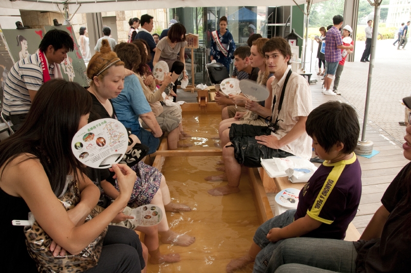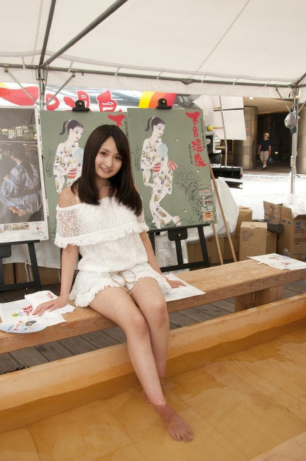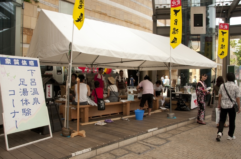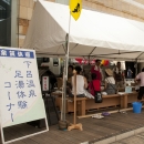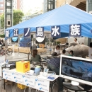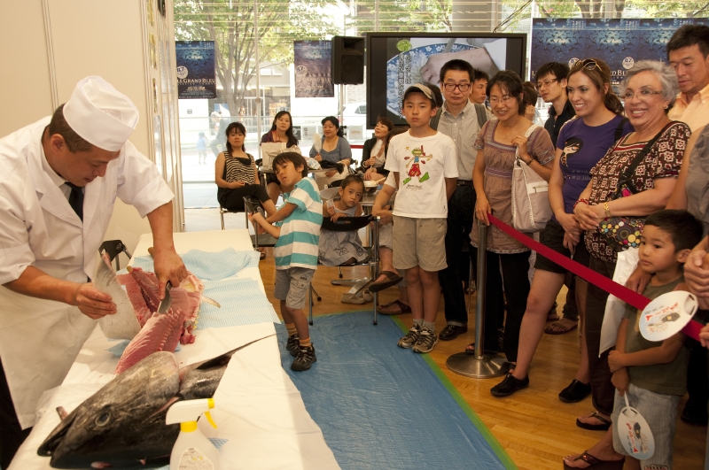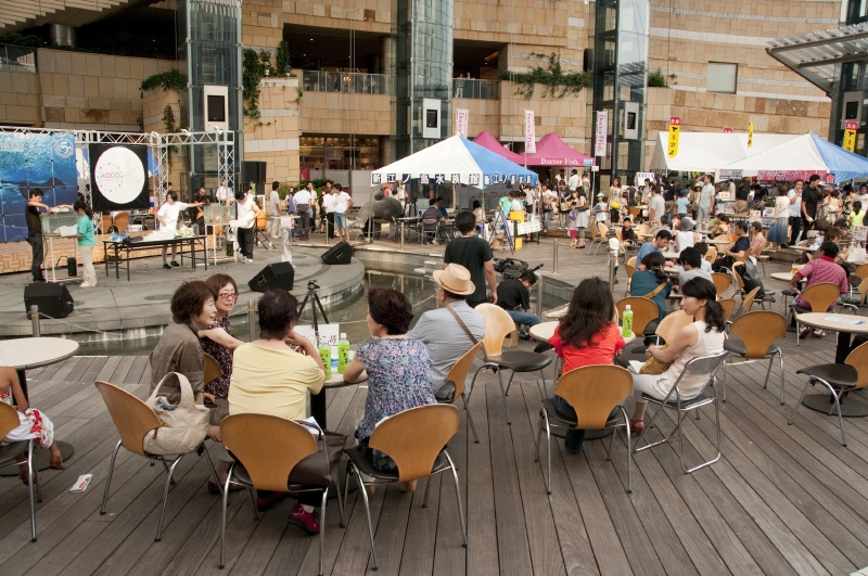 会場内のテントでは、下呂温泉の足湯や、ドクターフィッシュの体験、(一段目)新江の島水族館のクイズなども楽しめた。(四段目)ステージ上の「海の教室」では、プロサーファー中里尚雄氏の「海と触れ合う!スペシャル体験ワークショップ」(二段目)、海洋冒険家 白石康次郎氏の「これで君も海の男だ!ちびっこ、船のロープワーク遊び競争」(三段目左)、トライアスリート白戸太朗氏の「実はフルマラソンより楽って本当!?トライアスロン、おっかなびっくり体験講座」などが開催。(三段目右)「海カフェ」では、まぐろの解体ショーや、新鮮なふぐを堪能。(四段目)会場となった六本木ヒルズアリーナには、アクアリウムディスプレイコレクションの出展者による美しいアクアリウムがずらりと並び、涼しさを演出。新江の島水族館ブースでは子どもにヒトデなど海の生き物とのふれあいを提供したり、下呂温泉ブースでは、はるばる岐阜から温泉を運んでヒノキの足湯が設られたりと、数多くの来場者が癒され、憩う。また恒例となった「海メシ カフェ」では、下関唐戸市場から直送のトラフグや、マグロなどの新鮮な海の幸を使った海メシに、大勢の人々が舌鼓を打った。金魚すくいやヨーヨー釣りもあり、夏祭りのようなにぎわいに包まれていた。