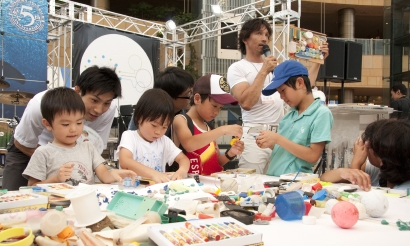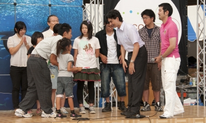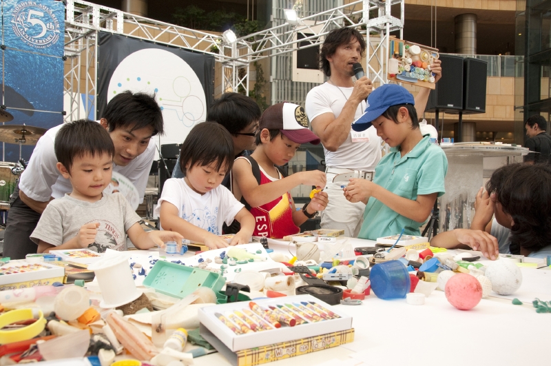 「イルカやクジラ、亀たちが、こうしたゴミを間違って食べてしまい、命を落としている。その現状を知ってほしい」と話し、会場に集まった子供たちをステージ上に招いた。そのゴミを使ってアート作品を作り、海を大切にするメッセージにした。