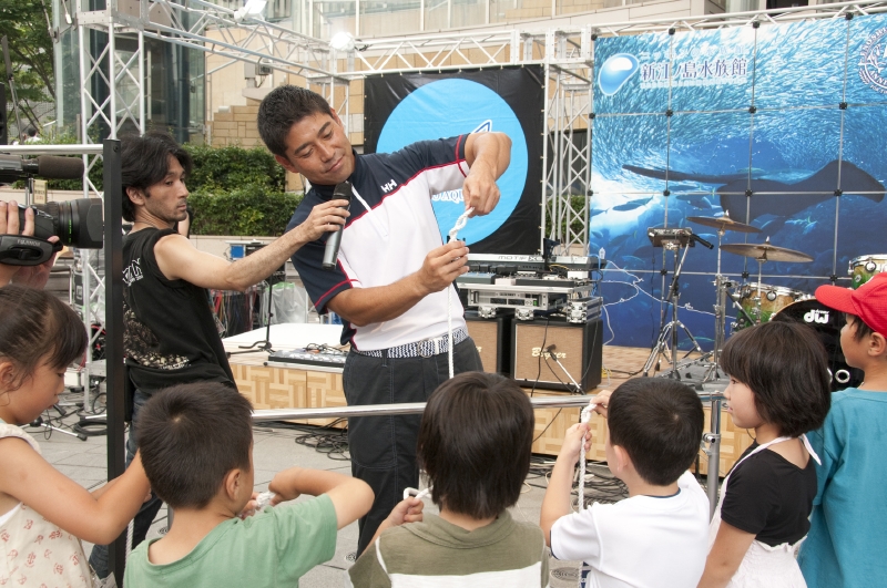 続いて登場したのは、世界最年少でヨット世界一周を果たしたファウスト、白石康次郎。彼はステージ上に子供たちを集め、ロープの結び方講座を開いた。