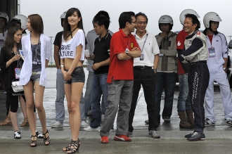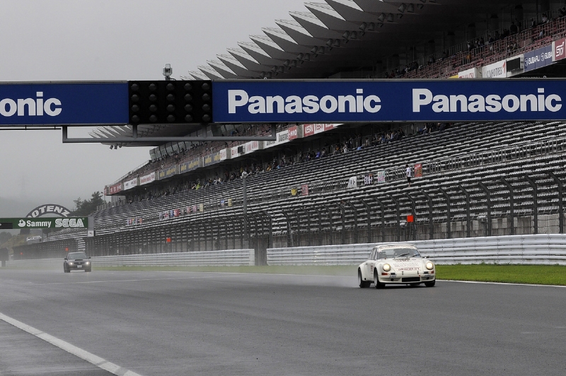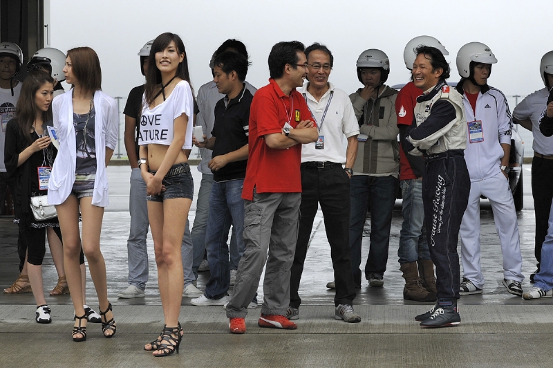 走行の開始は朝10時から。ブリーフィングを終えた会員とスタッフは1コーナー側のピットに移動、それぞれがヘルメットを渡され準備する。雨足も小雨程度とはいうものの路面はスリッピー。これから始まるイベントへの期待感は隠しようもない。FISCOは1周4.5kmとコースが長く、それぞれが2周、都合4分以上のスリルを味わえるはずだ。