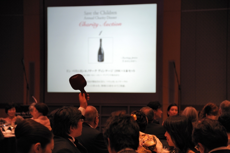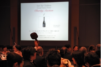 会の終盤はサザビーズによるチャリティオークション。「ドン ぺリニヨン レゼルヴ ドゥ ラベイ ヴィンテージ1973 マグナム」「ブルガリ ディアゴノ アルミニウム時計」など希少なアイテム計11点が拍手とともに次々と落札された。オークショニアはサザビーズジャパン石坂社長である。美しい手さばきで、上がった番号札に会場の注目を集めさせる。まさにプロの技を見せてもらった。