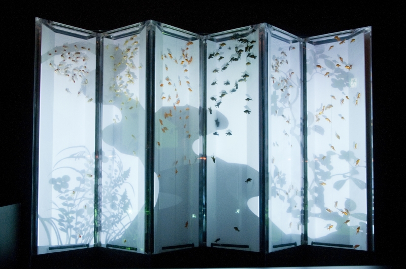 そして会場の最も奥に飾られているのは屏風水槽(ビョウブリウム)。この屏風の一幅には、金魚たちが泳ぎ、その向こうのスクリーンには、季節の花や鳥、川などの自然の風景が、影絵のように映し出される。その中を泳ぐ金魚たちもまた、移ろう風景の物語の中に取り込まれ、思わず時を忘れて見とれてしまう。