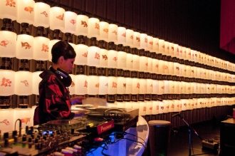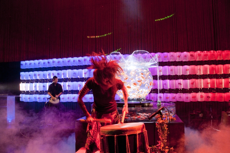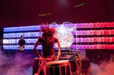 19時半。DJ JURIによるパフォーマンスが始まった。力強い太鼓と音楽に合わせて、花魁姿のダンサーが、巨大金魚鉢「花魁」の前でパワフルでセクシーなダンスを披露。来場者たちの熱気も高まっていく。