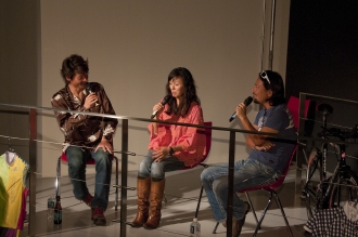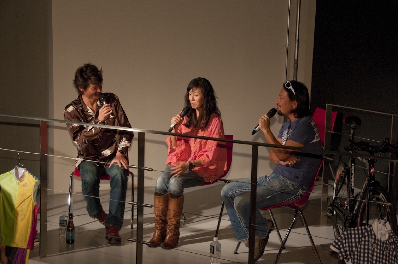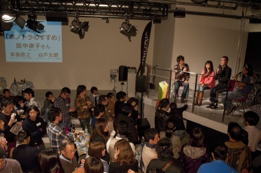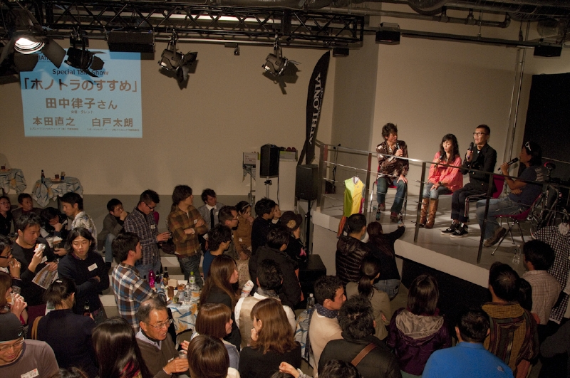 会場のボルテージがヒートアップしたところで、同イベント主催者である白戸氏とレバレッジコンサルティング代表でアスロニア取締役の本田直之氏 によるトークショー「ホノトラのススメ」がスタート。「ホノトラの最大の特徴である、穏やかな気候、透明度が高い美しい海、アップダウンの少ない緩やかなコース。これらの豊かな自然に囲まれた環境で、初心者はもちろん経験者も楽しみながら競技に挑戦できるのがこの大会の魅力」。ハワイに関する著書も多く手掛け、1年の半分をハワイで生活する本田氏の言葉に、来場者も期待に胸を膨らませる。本田氏のトライアスロンへの挑戦は当サイトでもレポートの通りだ(レポートはコチラ)。 そして、本日のスペシャルゲスト、タレントの田中律子さんが登場。 スキューバダイビングやヨガをこよなく愛する田中さんは、年始にブログで初めてのトライアスロンとなるホノトラ出場を宣言したばかり。「ホノトラを体験した友人の影響」と参加のきっかけを話す田中さん。体力に自信がなかったというが、白戸氏のアドバイスを受けて日々練習を続けていることを明かす。 さらにここでサプライズゲスト、TVプロデューサーのおちまさとさんも加わる。5年間毎日走り続けるおちさんだが、本田さんの声におされホノトラデビューを決意……!? と思いきや、まだ本人の中で気持ちの整理ができない様子。「5月20日当日、スタートラインに僕が立っているかどうかは、その時に確かめてみてください」と少し弱気な発言。しかしその後「一緒に頑張りましょう」という田中さんの力強い言葉に応じた。